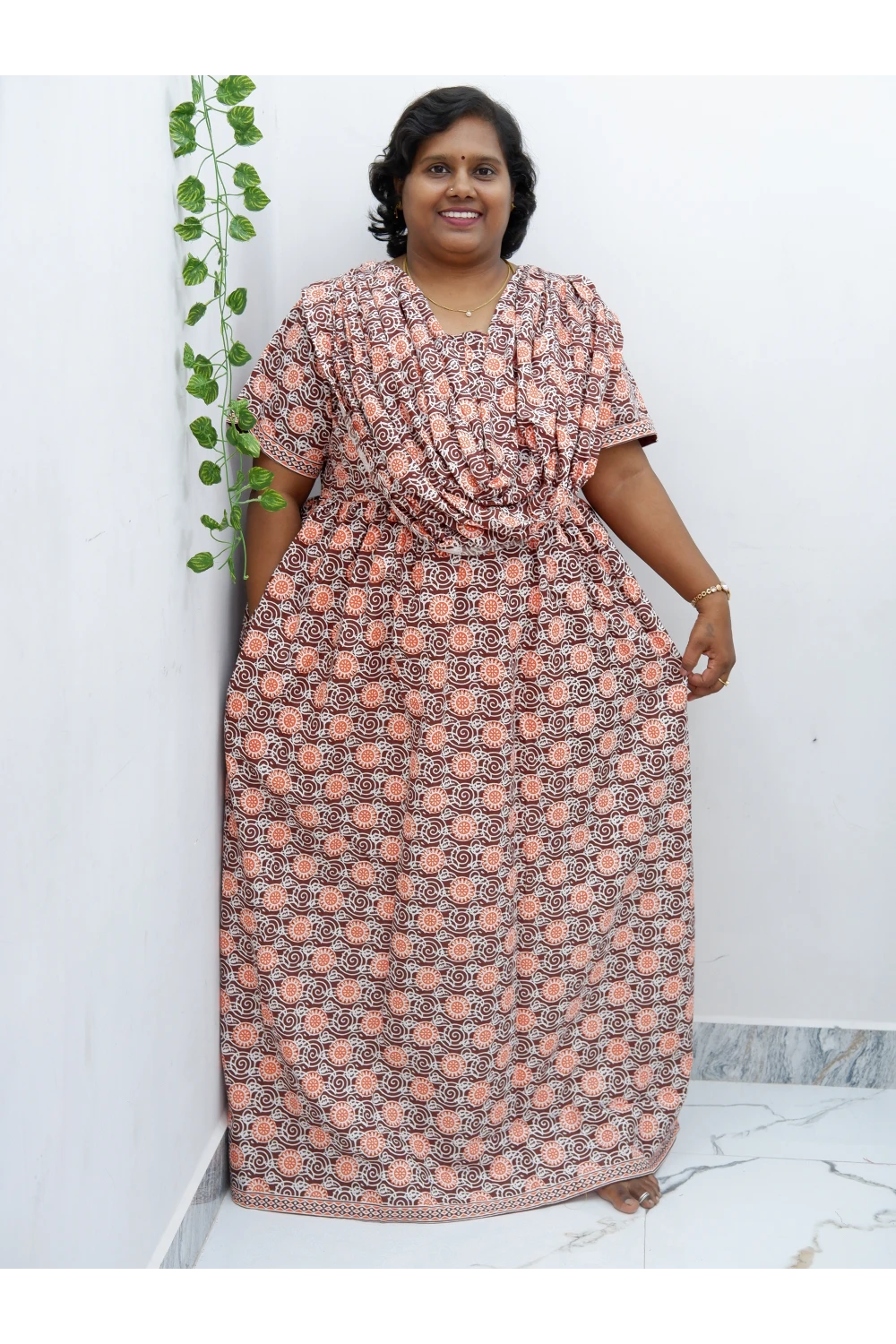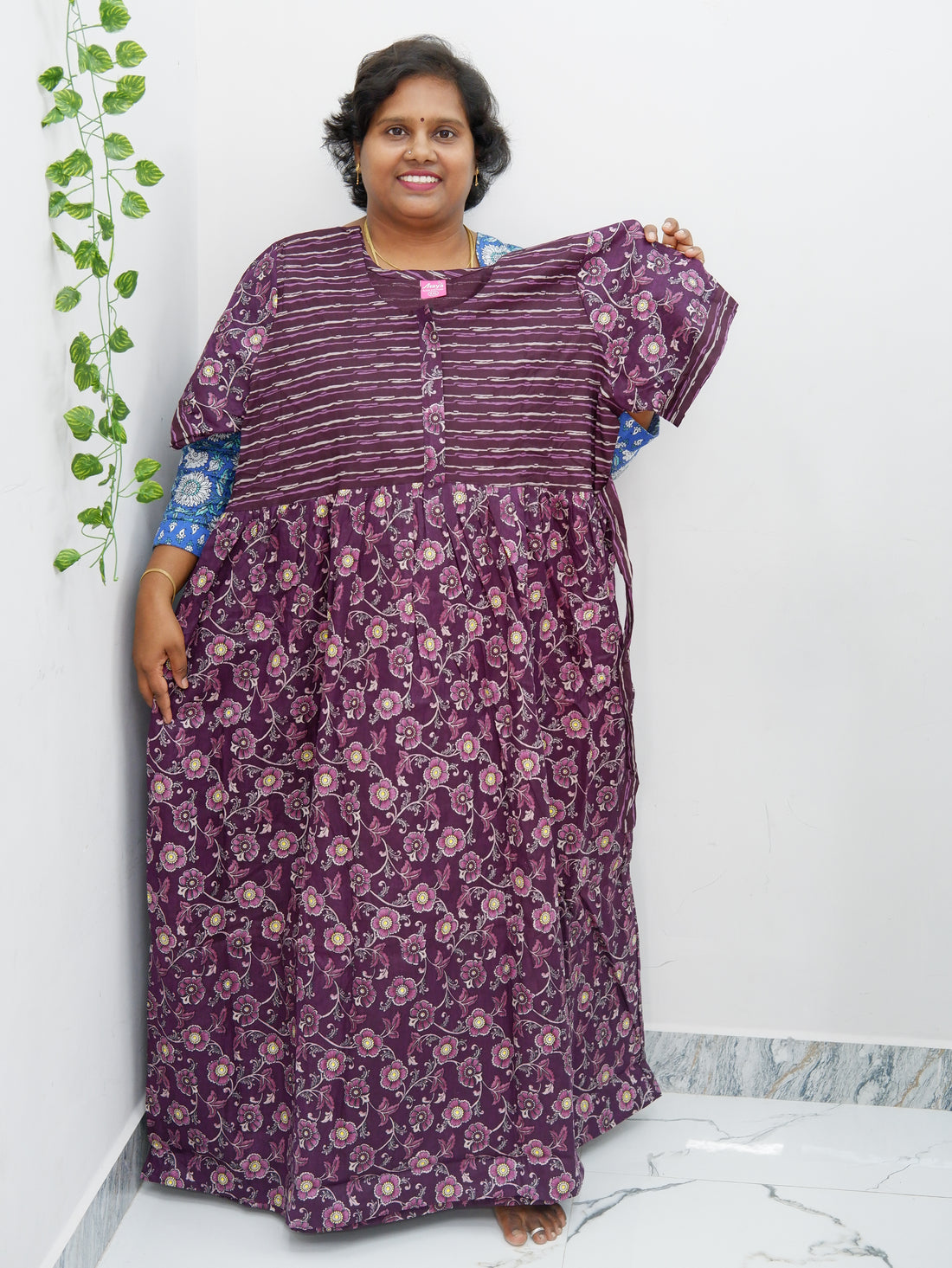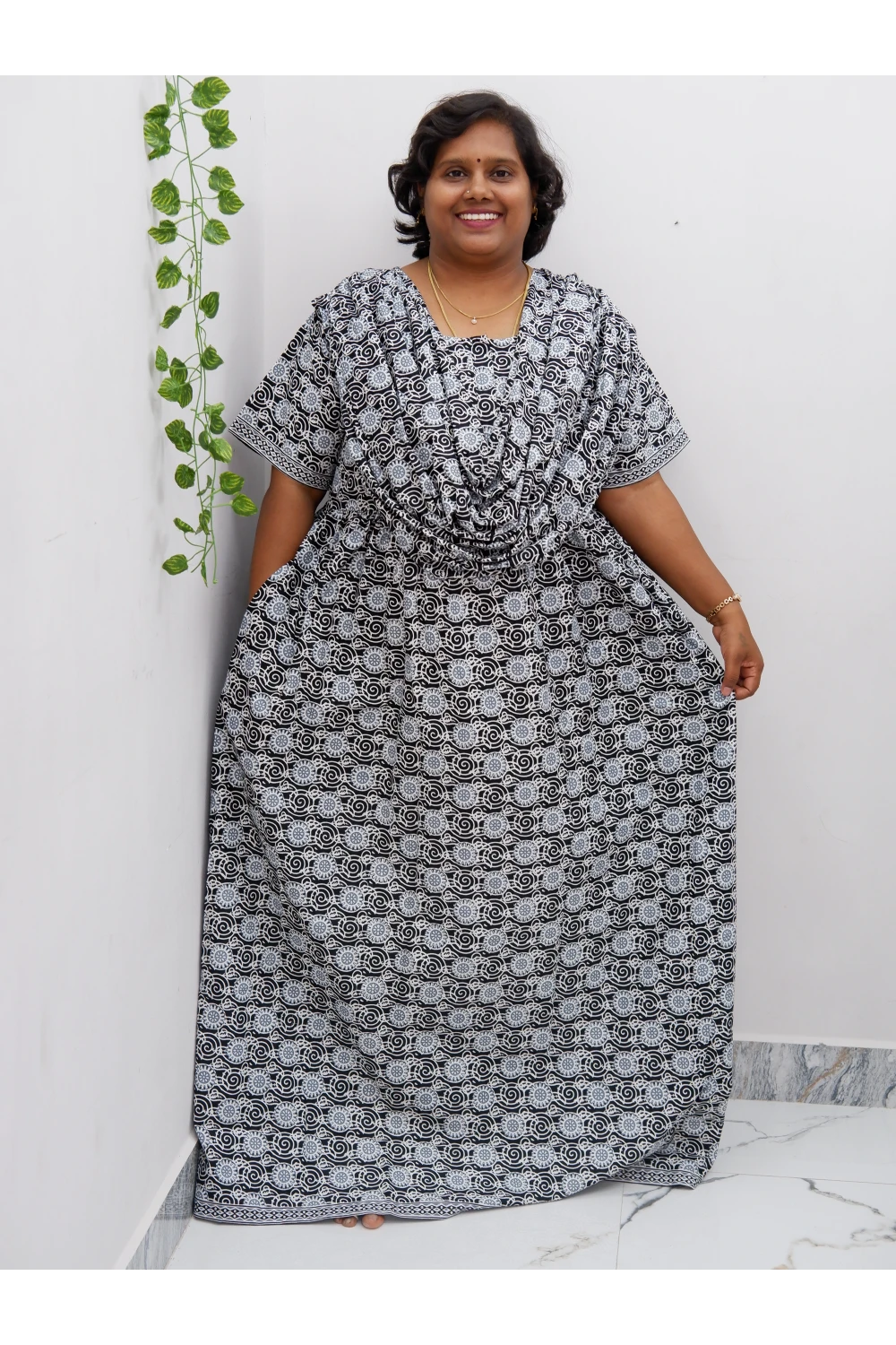 Experience unmatched comfort and style with our Shawl Draped Jyothi Cotton Frock Nighty, crafted from...